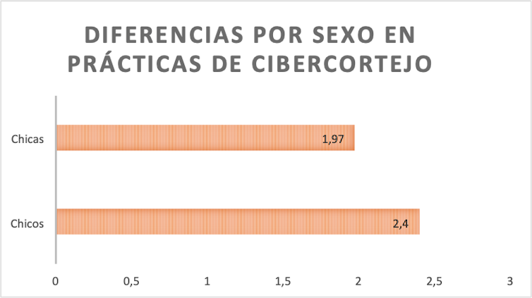 Además, conocemos que las chicas realizan menos prácticas de cibercortejo desajustadas que los chicos, y al menos una de cada dos chicas se sienten molestas cuando reciben estas conductas, tanto por parte de sus compañeros de clase como de sus parejas.