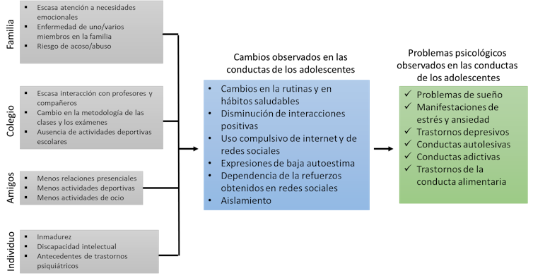 La pérdida de las costumbres y rutinas familiares, la ausencia del entorno estructurado de la escuela, el aburrimiento, las dificultades para participar en actividades deportivas y para salir con los amigos se encuentran entre las causas relacionadas con los problemas psicológicos detectados.